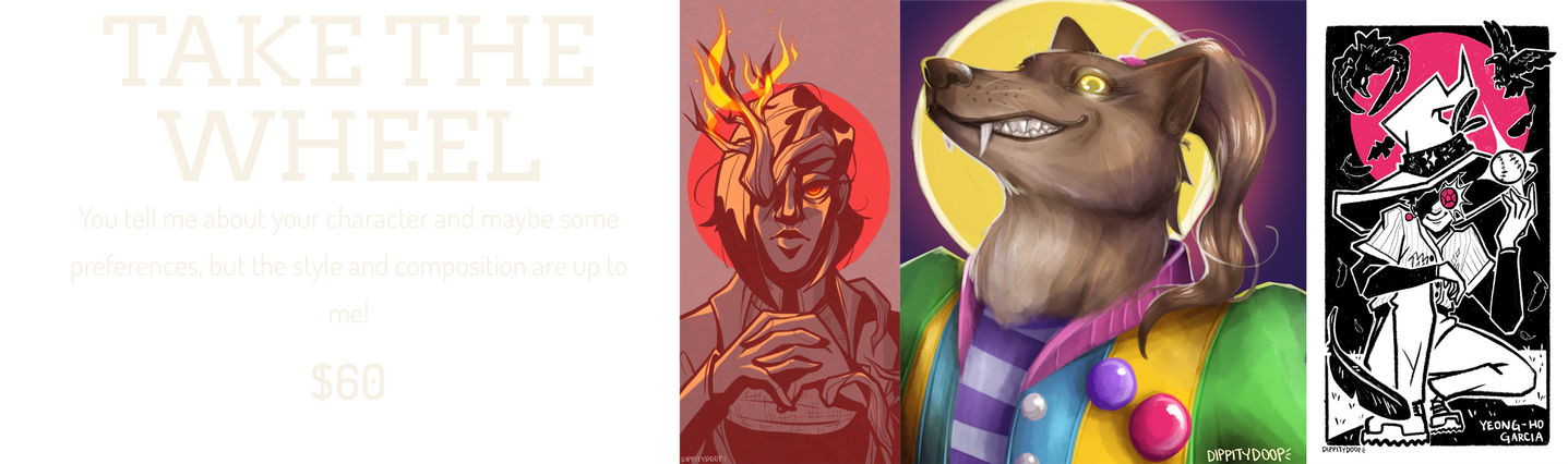 - Any past works I've done that you were inspired by! My drawing style tends to shift but I'd really like to get a feel for what you want from this commission!For Take-the-Wheel Commissions:I tend to be pretty safe when depicting other people's characters, but if there's anything absolutely off-limits for this commission, please let me know! (i.e. blood, weapons, skin showing, etc.)
