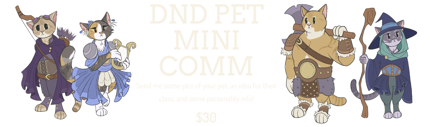 If your character has more than 2 pieces of equipment / weapons (instruments, swords, etc.), please choose the 2 most important ones to include! If you'd like more, it will cost a bit extra. Animal companions / familiars cost extra depending on style and how large the animal is!